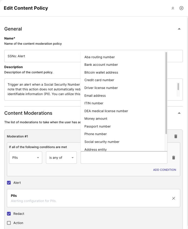 Predefined safety measures ensure AI behavior remains safe, ethical, and non-malicious. Guardrails include toxicity filters, bias detection, sensitive data protections, content validation, and exploit mitigation for common threats like prompt injection and jailbreaks.