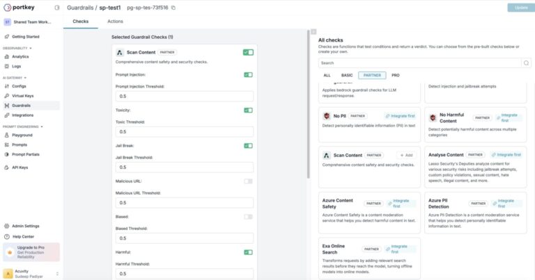 Guardrails act as programmatic controls to validate inputs, filter outputs, and enforce behavioral constraints. Especially critical for user-facing AI applications, Acuvity’s configurations can be embedded directly within PortKey and LiteLLM consoles for seamless integration.