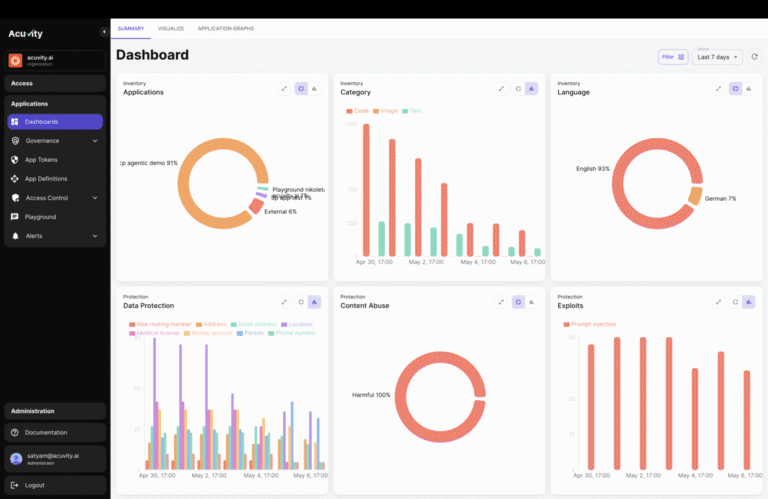 As enterprises embrace Generative AI, they face a rapidly evolving landscape of novel threats—prompt injections, model manipulation, and data exposure among them. Acuvity delivers proactive and adaptive defenses purpose-built for Gen AI environments. From real-time traffic monitoring to deep behavioral insights, Acuvity helps organizations secure AI usage at scale while maintaining visibility, compliance, and control. Acuvity’s Shadow AI Discovery gives you complete visibility into where and how Gen AI is being used. We detect thousands of services, flag high-risk tools, and provide real-time insights into data access and usage patterns. Whether it’s freemium AI apps, unauthorized plugins, or personal accounts accessing sensitive data, Acuvity uncovers it all—so you can take control, reduce risk, and empower secure innovation.